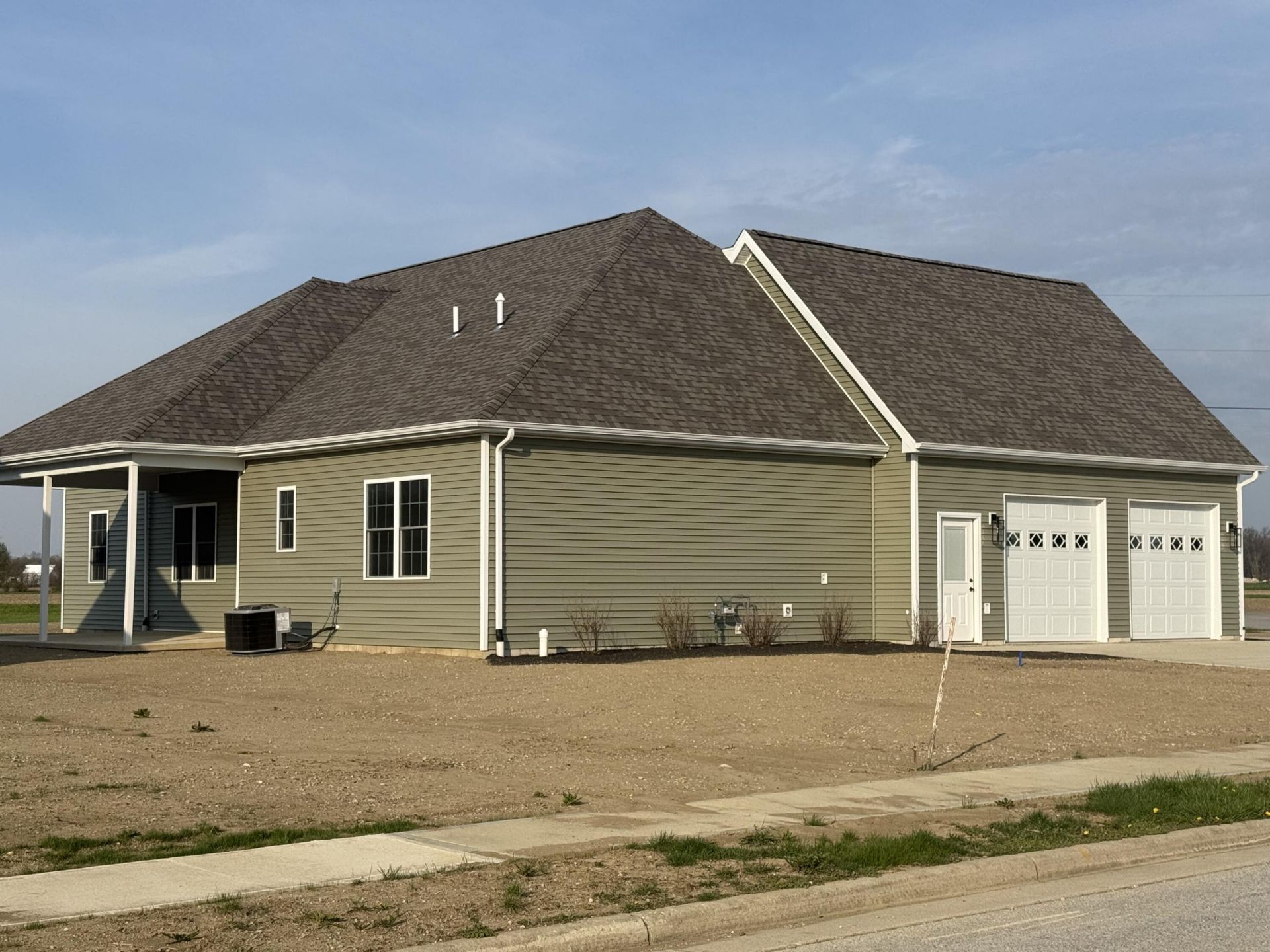 New construction with standout design and a highly functional layout, situated on a desirable corner lot approximately 100 x 150 (.37 acres). Offering 1,864 square feet, this home combines open-concept living with thoughtful finishes throughout.The great room features vaulted ceilings and abundant natural light, creating a bright and inviting main living space that flows seamlessly into the kitchen. The kitchen is designed for both everyday living and entertaining, featuring white cabinetry, a large center island with seating, and quartz countertops that continue throughout the home.This property includes three bedrooms and two and a half baths. The primary suite offers a spacious layout with a walk-in closet and a private bath featuring a walk-in shower. Two additional bedrooms and a full bath with tub/shower combination provide flexible living options.A generously sized laundry room includes a utility sink and additional workspace. The attached finished 2+ car garage offers convenience and storage.Additional features include white trim throughout, ceiling fans in every bedroom, and a covered back patio with direct access from the living room. Located in New Knoxville with eligibility for a 6-year tax abatement.