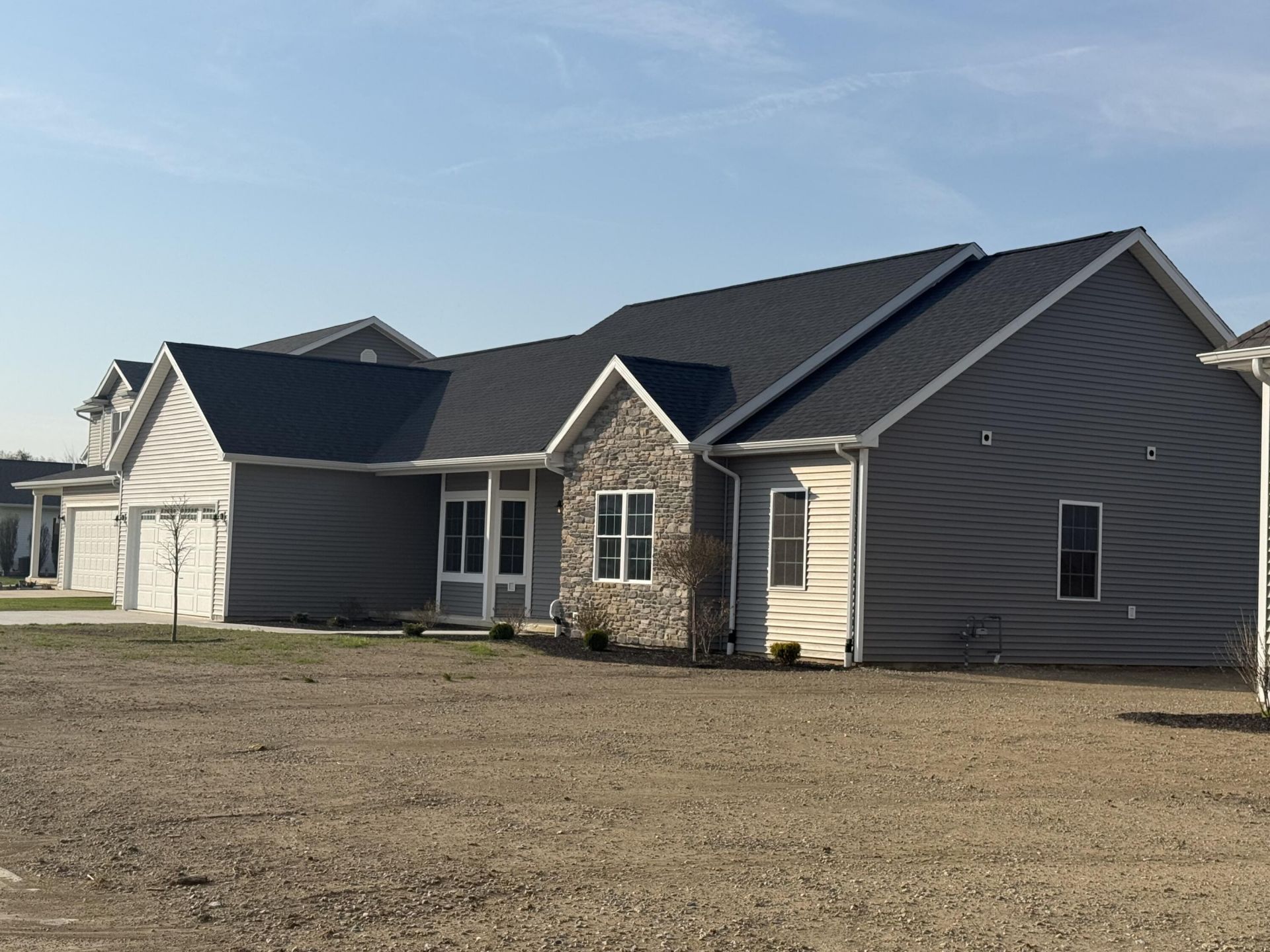 This move-in-ready new construction ranch in New Knoxville, Ohio offers 1,707 sq ft of thoughtfully designed living space with a clean, contemporary style. The exterior features gray vinyl siding with stone accents for a modern, low-maintenance finish. Inside, the home showcases custom maple cabinetry with crown molding, quartz countertops, and a spacious kitchen designed for both functionality and everyday living. A generous pantry and ample storage space add to the practicality of the layout. Durable floating vinyl flooring runs throughout the main living areas, complemented by maple trim and quality craftsmanship throughout. The open and functional floor plan provides comfortable living and easy flow between spaces. Custom windows bring in natural light, enhancing the overall feel of the home. Built with modern materials and energy-efficient features, this home offers long-term value and efficiency. A 6-year tax abatement provides potential property tax savings. Immediate possession available. Schedule your private showing today to experience the quality and design this home has to offer.