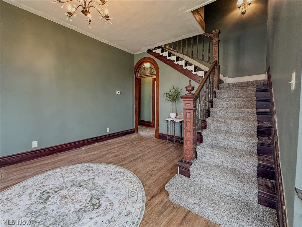 Rare opportunity! Step into this 122-year-old move in ready home blending timeless character with modern updates. The first floor features a foyer with oversized front doors and transom, bay window, arched stick and ball fretwork, restored staircase, and large covered porch. The main-level primary suite includes a walk-in closet, private bath with shower, and chandelier fan. The living room showcases the second bay window, fireplace mantel, and chandelier fan with medallion. The entire first floor has new waterproof LVP flooring. Eat-in kitchen with original custom cabinetry refreshed with new hardware and finishes, new countertops and sink, and new range hood and dishwasher. Built-in hutch, walk-in pantry, and bench seating complete the space. Mudroom leads to the re-decked back deck. Upstairs, three bedrooms with restored hardwood include one with double closets and a decorative fireplace mantel. Second-floor bath has double vanity and bath/shower combo. Dedicated laundry room with folding counter and storage space houses a second water heater serving the second and third floors. Entire third floor is a flexible fifth bedroom with closet, new half bath, built-in bench under eyebrow window, and mini-split system. Full basement with 1-car attached garage. Original details like crown molding, chair rails, and double baseboards appear throughout. All first and second floor bedrooms have ceiling fans with remotes. Updated systems include complete electrical rewire, central air, zoned HVAC, dual water heaters, new metal roof and siding, and new custom-sized windows with transferable warranty. Two decorative rain chains complete the exterior. Corner lot, minutes from shops, schools, and Sally Buffalo Park offering a timeless blend of character and modern comfort.