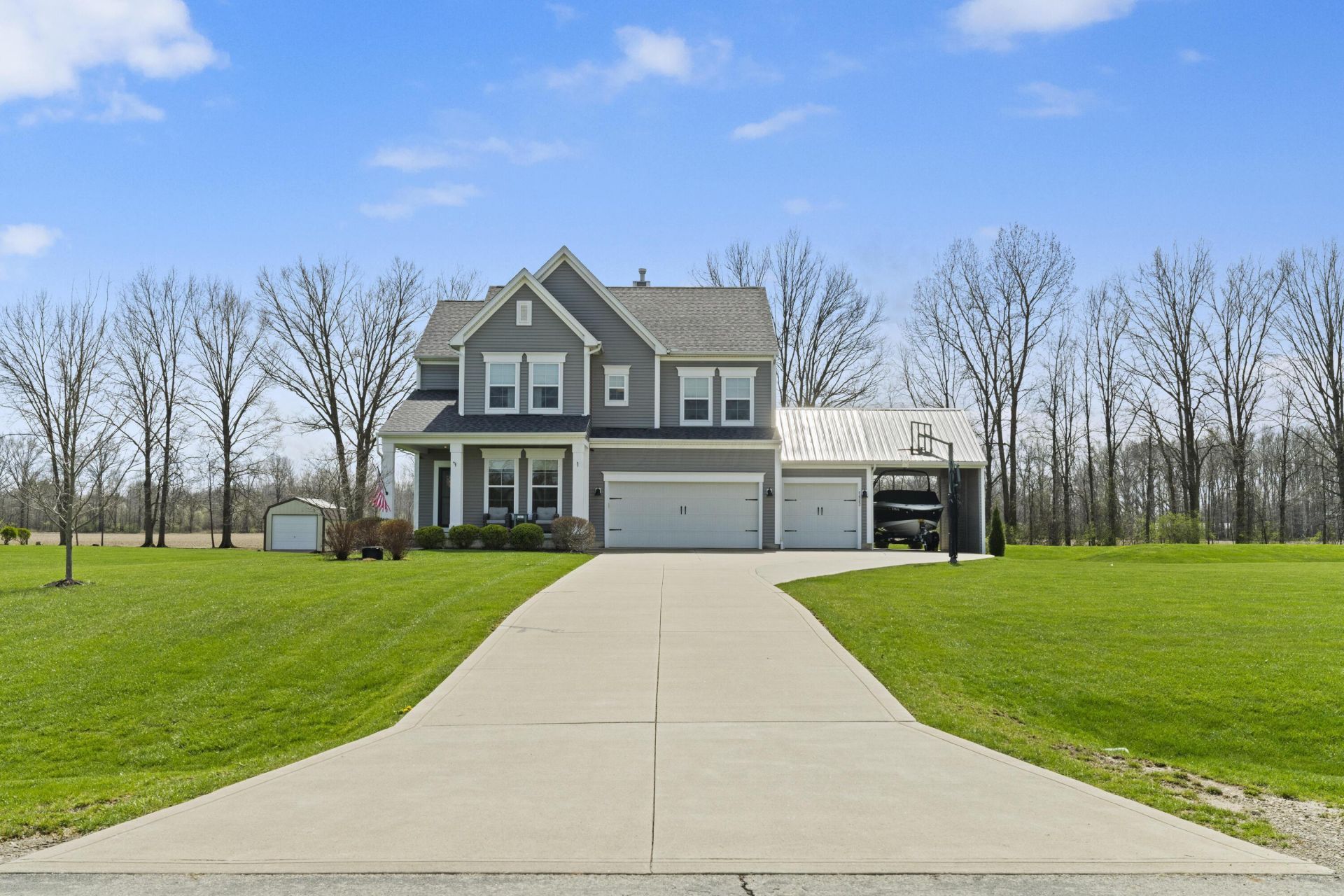 Welcome to our NEWEST Sunbury listing in the Estates at Cheshire community! This gorgeous 5-Level Split floorplan features 4 bedrooms, 2 full baths, 2 half bath, and over 4,149 finished sqft situated on 1.474 acres. Covered Front Porch. Spacious Entryway with built-in bench! 1st floor office/den with French Doors, hardwood floors and custom wall trim with built-in desk! Dining Room updated lighting! Two-Story Great Room with a gas fireplace with new tile and custom trim plus a wall of windows, overlooking the private backyard & acreage. Large Kitchen with upgraded island featuring Quartz countertop with seating, NEW single basin sink and NEW Faucet! Stainless Steel appliances, including dishwasher, refrigerator, glass top range with above-the-range microwave! Walk-in Pantry too! Eat-in Area with sliding doors to the composite deck and stamped concrete patio! Up one level to the Primary Suite, which features a tray ceiling and ceiling fan with Ensuite, featuring a double-sink vanity with granite countertops, soaking tub and walk-in shower plus separate water closet. Walk-in closet, too! Up another level you'll find 3 additional bedrooms, including a Jack n' Jill bath between 2 of the bedrooms! Plus loft area, used as a workspace! 2nd floor Laundry Room! Down one level from the main entry, you'll find a daylight lower level with Entertaining Kitchen with full size refrigerator, wine storage, granite countertops and sink! It's the perfect Media Room/Family Room/Play Room! Bose surround-sound speakers. 2nd Half Bath, too! The basement has storage and a gym area! Outside, is the composite decking, stamped concrete patio with firepit plus a 2021 Hot Tub, perfect for relaxing nights! 26 x 12 storage shed +electric! Have a boat? This home has a BoatPort for easy storage of your boat, (mins to Alum Creek!) with an additional 3 car att. garage! NEW Main Roof in 2024, NEW Metal Roof in 2025, NEW Sump Pump, NEW Landscaping. Big Walnut Schools. Great location!